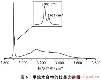 氣體水合物的結(jié)構(gòu)有以下4種:Ⅰ型(立方晶體結(jié)構(gòu))、Ⅱ型(菱形晶體結(jié)構(gòu))、H型(六方晶體結(jié)構(gòu))以及新近發(fā)現(xiàn)的T型(它是由生物分子和水分子生成的),其中前面3種較為常見。Ⅰ型結(jié)構(gòu)含46個水分子和最多8個氣體分子,Ⅱ型結(jié)構(gòu)含136個水分子和最多24個氣體分子,H型結(jié)構(gòu)含34個水分子和最多6個氣體分子。對水合物結(jié)構(gòu)進(jìn)行分析,主要采用激光拉曼光譜、核磁共振和X-衍射法。Sum等[12]的研究表明激光拉曼光譜是一個很有潛力的測定水合物晶體結(jié)構(gòu)的工具,它可以測定水合物晶腔中氣體分子的伸縮振動的拉曼位移(Raman Shift),而且拉曼強(qiáng)度與分子的數(shù)量成正比。圖6為實驗測得的甲烷水合物的拉曼譜圖,小圖中2905cm-1和2915cm-1附近分別是處于大、小籠中甲烷分子的伸縮振動拉曼峰。純甲烷氣體的拉曼譜峰在2917cm-1附近,水合物中甲烷分子的伸縮振動峰發(fā)生分裂呈現(xiàn)雙峰,而且向低波數(shù)遷移,這主要是由于水合物中甲烷分子填充在水分子通過氫鍵構(gòu)建起來的籠子中,甲烷分子與大、小籠之間的相互作用不同,所處的化學(xué)環(huán)境存在差異,從而使得甲烷的拉曼譜峰發(fā)生分裂。甲烷分子化學(xué)環(huán)境的差異也說明甲烷水合物中兩種籠型結(jié)構(gòu)的存在。實驗測得甲烷水合物大、小籠拉曼峰強(qiáng)度(峰面積)的比值基本上都為3:1,這與工型結(jié)構(gòu)水合物晶胞中大、小籠的個數(shù)比是一致的(工型結(jié)構(gòu)一個晶胞中包括6個籠和2個小籠),由此可以斷定甲烷水合物為工型結(jié)構(gòu)水合物。水合物的拉曼譜圖中,3078cm-1附近的峰是O—H鍵的伸縮振動位移,是水合物中與氣體分子相結(jié)合的水的拉曼峰。根據(jù)甲烷雙峰和結(jié)構(gòu)水峰可以很容易地將水合物與自由氣以及冰加以區(qū)分。