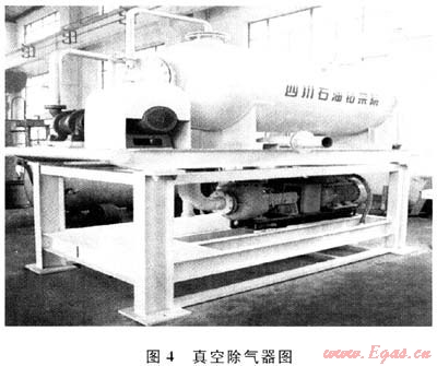 在鉆井作業(yè)過程中,地層中的氣體往往會侵入到鉆井液中,形成大量的大小不等的氣泡。在密閉系統(tǒng)中,四相分離器只能清除體積較大的氣泡,對于溶解在鉆井液中的微小氣泡卻難以清除,而這些微小氣泡會造成鉆井液密度降低、黏度升高、流動性變差,從而影響了鉆井液的性能。為了維護鉆井液的性能,在密閉系統(tǒng)中配置密閉式鉆井液緩沖罐及真空除氣器(圖4)。鉆井液緩沖罐主要作用是使鉆井液流速平穩(wěn)滿足真空除氣器的工作要求。真空除氣器的作用是清除四相分離器無法分離的微小氣泡。川慶鉆探工程公司鉆采工藝技術(shù)研究院研制成功的ZCQ2/3真空式除氣器已在塔里木迪那區(qū)塊和川渝地區(qū)鉆井中得到成功的使用[4]。該除氣器用于密閉系統(tǒng)時,需對密封等機構(gòu)進行防硫改造以滿足密閉系統(tǒng)的要求。