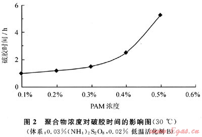 將不同質(zhì)量分?jǐn)?shù)的PAM加入相同的氧化還原體系,并加入調(diào)節(jié)劑A后,與ZrOCl2為1%的溶液按100:3.5的配比混合進(jìn)行交聯(lián),測(cè)得在40℃破膠時(shí)間(圖2)。