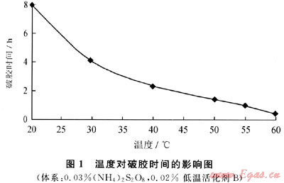 在高于50℃的條件下,過(guò)硫酸銨分解反應(yīng)所需要的能量由周?chē)h(huán)境提供,反應(yīng)能順利進(jìn)行;而在煤層溫度(20~40℃)時(shí),由于周?chē)h(huán)境不能很好提供過(guò)硫酸鹽分解所需的能量,過(guò)硫酸鹽的游離氧釋放速度大大降低,因而其破膠能力迅速下降。氧化還原體系是通過(guò)低溫活化劑劑引發(fā)過(guò)氧化物的自由基,在低溫下釋放出氧破壞凍膠結(jié)構(gòu),使大分子降解從而達(dá)到破膠的目的[4~5]。低溫活化劑與過(guò)硫酸銨作用為放熱反應(yīng),并且有一定的延遲釋放特性。