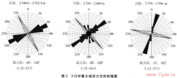 3口井測(cè)量井段內(nèi)橢圓井眼現(xiàn)象不太明顯,地應(yīng)力較均衡,在不同時(shí)期構(gòu)造形成過(guò)程中略有變化,確定的主應(yīng)力方向?yàn)楸睎|-南西向(圖3)。