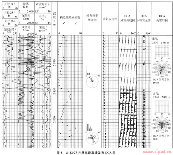 利用地層傾角測(cè)井識(shí)別裂縫效果較好,電導(dǎo)率異常檢測(cè)(DCA)求出由各極板與相鄰兩個(gè)極板的電導(dǎo)率的最小正差異,把這個(gè)最小正差異疊加在該極板的方位曲線上,作為判斷裂縫的標(biāo)志。DCA成果圖直接顯示出裂縫的方位,排除了由地層層理等引起的電導(dǎo)率異常,突出了與裂縫相關(guān)的電導(dǎo)率異常。