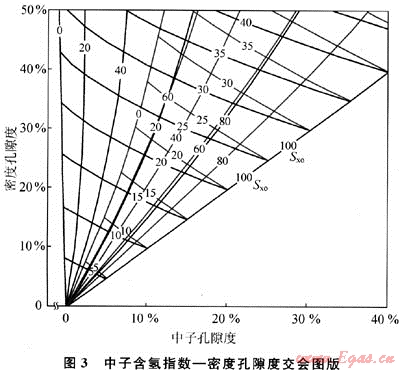 根據(jù)中子測井含氫指數(shù)和經(jīng)骨架密度校正的密度孔隙度,進入中子含氫指數(shù)密度孔隙度交會圖版(圖3),再根據(jù)儲層深度選擇相應(yīng)的關(guān)系曲線族,則由交會點位置可得到地層孔隙度(φ)。由中子測井含氫指數(shù)及計算出的密度孔隙度,在此交會圖可查出其對應(yīng)的地層孔隙度及沖刷帶含水飽和度(Sxo)。