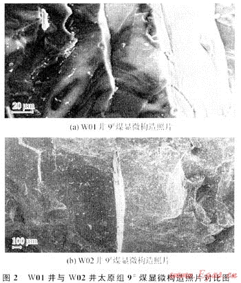 通過(guò)WO1井和W02井煤樣品的顯微構(gòu)造照片對(duì)比,可清楚地觀察到兩口鉆孔巖心顯微構(gòu)造的明顯差異。WO1井所處的構(gòu)造位置是應(yīng)力場(chǎng)低值分布區(qū),煤巖割理裂隙十分發(fā)育。圖2-a顯示出在大約100μm長(zhǎng)度范圍內(nèi)分布有條微裂隙,裂縫明顯地具有張剪性力學(xué)特性;而W02井由于處應(yīng)力場(chǎng)高值分布區(qū),煤巖裂縫分布密度低且為閉合(圖2-b)。