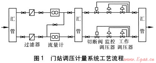 天然氣門站是城市天然氣輸配系統(tǒng)的氣源點,應具備過濾、調壓、計量、安全切斷、運行路和備用路自動切換等主要功能,確保供氣的連續(xù)性、安全性和穩(wěn)定性。為保證天然氣門站供氣的可靠性,在其計量單元和調壓單元均設有備用路[4]。門站調壓計量系統(tǒng)工藝流程見圖1。