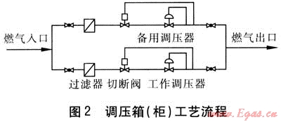 用戶調壓箱(柜)的功能是接受城市中壓管網來氣,并將天然氣壓力降至2500~3000Pa,輸送至庭院低壓管道供應居民用戶使用[11]。調壓箱(柜)工藝流程(采用兩路調壓)見圖2。