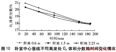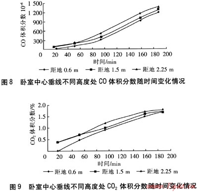 臥室中心垂線上3個(gè)測(cè)點(diǎn)中,C0最高體積分?jǐn)?shù)為0.138%,02最低體積分?jǐn)?shù)為17.9%,C02最高體積分?jǐn)?shù)為1.8%,均出現(xiàn)在距地2.25m處的測(cè)點(diǎn)上。C0、C02體積分?jǐn)?shù)隨時(shí)間的增加呈上升趨勢(shì),02體積分?jǐn)?shù)隨時(shí)間的增加而下降。在同一垂線,距地面2.25m處的C0、C02體積分?jǐn)?shù)與距地面1.5m和0.6m處較接近,這說(shuō)明煙氣在垂線位置的體積分?jǐn)?shù)分布已趨于一致。