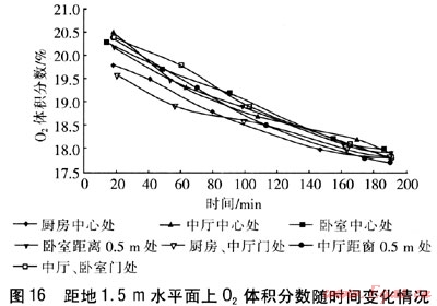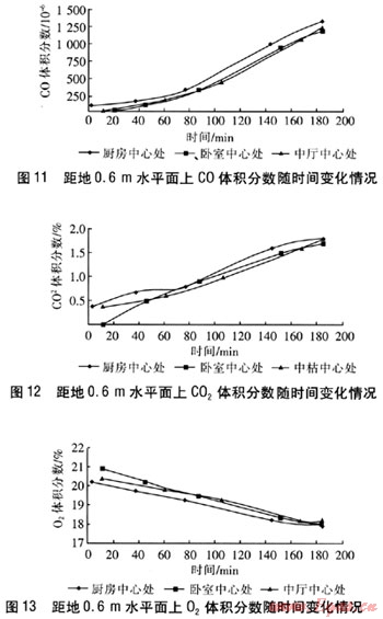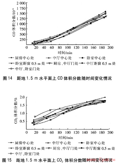 在距地面1.5m水平面上共有7個(gè)測(cè)點(diǎn),C0最高體積分?jǐn)?shù)為0.157%,位于中廳距窗0.5m處測(cè)點(diǎn);02最低體積分?jǐn)?shù)為17.7%,位于中廳距窗0.5m處測(cè)點(diǎn);C02最高體積分?jǐn)?shù)為2.0%,位于廚房中心處測(cè)點(diǎn)。C0、C02體積分?jǐn)?shù)隨時(shí)間的增加呈上升趨勢(shì),02體積分?jǐn)?shù)隨時(shí)間的增加而下降。在同一水平面上,室內(nèi)各點(diǎn)的C0、C02體積分?jǐn)?shù)較接近。說(shuō)明在這一水平面上,煙氣的擴(kuò)散速度較快,各點(diǎn)的污染物體積分?jǐn)?shù)較均勻。