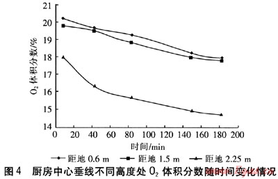 在距地面2.25m水平面上,C0最高體積分?jǐn)?shù)為0.4%,02最低體積分?jǐn)?shù)為14.7%,C02最高體積分?jǐn)?shù)為3.7%,均出現(xiàn)在廚房中心處的測(cè)點(diǎn)上。C0、C02體積分?jǐn)?shù)隨時(shí)間的增加呈上升趨勢(shì),02體積分?jǐn)?shù)隨時(shí)間的增加而下降。在同一水平面上,廚房?jī)?nèi)的C0、C02體積分?jǐn)?shù)略高于中廳和臥室,中廳和臥室的C0、C02體積分?jǐn)?shù)較接近。這與測(cè)試時(shí)間稍有差異有關(guān)。