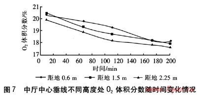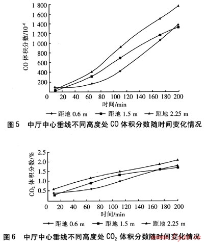 中廳中心垂線上的3個(gè)測(cè)點(diǎn)中,C0最高體積分?jǐn)?shù)為0.176%,02最低體積分?jǐn)?shù)為17.6%,C02最高體積分?jǐn)?shù)為2.1%,均出現(xiàn)在距地2.25m處的測(cè)點(diǎn)上。中廳C0、C02體積分?jǐn)?shù)隨時(shí)間的增加呈上升趨勢(shì),02體積分?jǐn)?shù)隨時(shí)間的增加而下降。在同一垂線,距地面2.25m處的C0、C02體積分?jǐn)?shù)略高于1.5m和0.6m處,這說(shuō)明隨煙氣溫度的降低,向上浮力減弱。