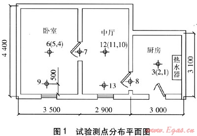 在3個(gè)房間內(nèi)共布置了13個(gè)測(cè)點(diǎn),測(cè)點(diǎn)2、5、11分別位于廚房、臥室和中廳的中心,7、8、9分別位于臥室和中廳門(mén)、中廳和廚房門(mén)以及臥室靠外窗處,其中測(cè)點(diǎn)1、2、3位于同一垂線,4、5、6和10、11、12分別位于同一垂線。測(cè)點(diǎn)分布平面圖見(jiàn)圖1,圖中建筑尺寸的單位為mm。同一垂線上的3個(gè)點(diǎn)的標(biāo)高分別為0.60m、1.50m、2.25m。熱水器為6L/min直排式燃?xì)鉄崴?,熱?fù)荷為11.4kW,連續(xù)燃燒。