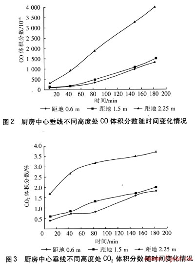在距地面0.6m水平面上,C0最高體積分?jǐn)?shù)為0.132%,02最低體積分?jǐn)?shù)為17.9%,C02最高體積分?jǐn)?shù)為1.8%,均出現(xiàn)在廚房中心處的測(cè)點(diǎn)上。C0、C02體積分?jǐn)?shù)隨時(shí)間的增加呈上升趨勢(shì),02體積分?jǐn)?shù)隨時(shí)間的增加而下降。在同一水平面上,廚房?jī)?nèi)的C0、C02體積分?jǐn)?shù)略高于中廳和臥室,中廳和臥室的C0、C02體積分?jǐn)?shù)較接近。這與測(cè)試時(shí)間稍有差異有關(guān)。