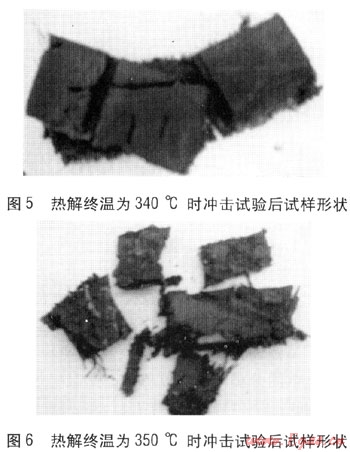 可以看出,隨著熱解終溫的升高,試樣的沖擊韌度逐漸減小。熱解終溫為330℃與340℃時試樣破碎時的沖擊韌度沒有太明顯的變化,在熱解終溫為350℃時沖擊韌度明顯減小,熱解終溫為360℃時沖擊韌度減小得更多。熱解終溫為330℃時沖擊試驗后的試樣形狀見圖4,熱解終溫為340℃時沖擊試驗后的試樣形狀見圖5,熱解終溫為350℃時沖擊試驗后的試樣形狀見圖6。