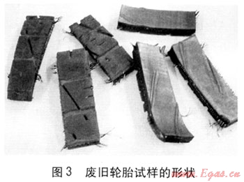 實驗樣品來自天津市某汽車修理廠的夏利牌轎車的廢舊輪胎,型號為165/70R 13 79T,廢舊輪胎(含鋼絲和簾布)被切割成大約為7cm×3cm的長塊,見圖3。