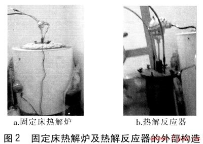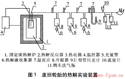 固定床熱解爐由耐高溫不銹鋼材料制成,直徑為200mm,高度為350mm,功率為7.5kW。在固定床熱解爐內套有一個直徑為100mm,高度為150mm的熱解反應器,用以盛裝實驗樣品,反應器蓋上設有出氣管、充氮管和熱電偶。為使熱解氣中的可凝氣體充分冷凝下來,冷凝器采用3組U型套管式水冷冷凝器,在其底部裝有桃形分液漏斗,接受冷凝下來的熱解油,每組冷凝器的進出口均設有溫度測點。廢舊輪胎的熱解過程在密閉、微正壓的條件下進行,產(chǎn)生的氣體中不含有毒物質,因此將去除可凝氣體后的不凝結氣體經(jīng)過流量計后,排出室外燃燒。在冷凝器和流量計之間安裝了U型管壓差計,以便觀察實驗過程中系統(tǒng)內的壓力變化情況。