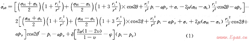 從式(1)可以看出:當(dāng)pi增大時,σ′pθ變??;當(dāng)pi增到一定程度時,σ′pθ將變成負(fù)值,即巖石所受周向應(yīng)力由壓縮變?yōu)槔?,?dāng)這種拉伸力大到足以克服巖石的抗拉強(qiáng)度時,地層則產(chǎn)生破裂,此時值為破裂壓力。