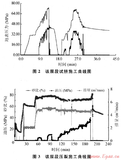 圖2為FS-3井4825.8~4852.2m層段的試擠施工曲線。從試擠曲線可以看出,提排量井口壓力升至73MPa地層破裂,降排量之后的停泵測壓降表明地層吸液能力較好。考慮到該層吸液能力較好,因此提出了將前置液量增加30m3。從FS-3井的壓裂施工曲線(圖3)可以看出,本層段施工注入預(yù)置液60m3、總液量717.6m3,加入0.45~0.9mm的Carbo陶粒70m3,平均砂比20%,最高砂比達(dá)39%。該層段施工圓滿完成了70m3的加砂任務(wù)。采用凈壓力擬合軟件,對該層位施工曲線進(jìn)行了凈擬合分析,擬合的縫長為208.3m,達(dá)到了造長縫的設(shè)計(jì)要求,表明該井得到了有效的改造。據(jù)該層段壓后排液數(shù)據(jù)統(tǒng)計(jì),該井小型壓裂進(jìn)液20m3,大型壓裂進(jìn)液711.3m3,井筒以1500m計(jì)算60m3,累計(jì)791.3m3,返排96.3%,如不考慮小型壓裂,則返排率98.8%;壓后產(chǎn)氣量高達(dá)5.6×104m3/d,達(dá)到了良好的預(yù)期效果,表明對該井采取的壓裂技術(shù)措施總體是可行的。