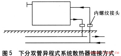 下分雙管異程式系統(tǒng)適用于中小面積戶型,如兩室兩廳兩衛(wèi),建筑面積約120m2,其調(diào)節(jié)性能優(yōu)于下分單管式系統(tǒng)。散熱器連接方式見圖5,供回水塑料管由三通引出后,采用內(nèi)螺紋接頭與地面上鍍鋅鋼管連接,但此處需預(yù)留施工槽,以便檢修三通管件。