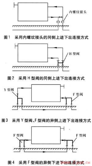 散熱器連接方式推薦采用以下4種:a.同側(cè)上進(jìn)下出(見圖1),塑料管出地面后,采用內(nèi)螺紋接頭與地面上鍍鋅鋼管連接,安裝簡單,造價(jià)低,出地面只有一處,工程中經(jīng)常采用。b.同側(cè)上進(jìn)下出(見圖2),塑料管出地面后,采用H型閥與地面上鍍鋅鋼管連接,安裝簡單,出地面只有一處,但H型閥價(jià)格高,工程中較少采用。c.異側(cè)上進(jìn)下出(見圖3),塑料管出地面后,采用Y型閥和F型閥與地面上鍍鋅鋼管及散熱器連接,出地面有兩處,造價(jià)高。d.異側(cè)下進(jìn)下出(見圖4),塑料管出地面后,采用兩個(gè)F型閥與地面上散熱器連接,出地面有兩處,造價(jià)高。