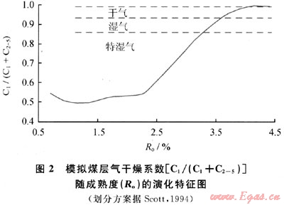 C1/(C1+C2-5)系數(shù)在指示煤層氣特征方面具有比CO2含量更好的優(yōu)勢(shì),體現(xiàn)在這一指標(biāo)參數(shù)受到外界的影響較小,具有相對(duì)穩(wěn)定性。這主要因?yàn)榧淄楹椭責(zé)N氣體均具有比較相似和穩(wěn)定的物理性質(zhì)。圖2為模擬煤層氣的C1/(C1+C2-5)系數(shù)隨Ro的變化關(guān)系。C1/(C1+C2-5)系數(shù)值隨成熟度的增加,首先出現(xiàn)先短暫降低,在大約位于Ro=1.0%處達(dá)到最低值0.5,之后呈持續(xù)增大趨勢(shì)。Scott等[4]將C1/(C1+C2-5)系數(shù)值小于0.86定義為特濕煤層氣,0.86~0.94為濕氣,0.94~0.99為干氣,大于0.99為特干氣。當(dāng)Ro達(dá)到4.0%以后,模擬的煤層氣C1/(C1+C2-5)系數(shù)值均大于0.99,達(dá)到了特干氣的程度。而達(dá)到干氣的時(shí)間是Ro=3.6%,其余的成熟度演化階段中生成的煤層氣主要以濕氣和特濕氣為主。在一些煤層氣藏分布區(qū),煤鏡質(zhì)體反射率小于4.0%時(shí),干燥系數(shù)C1/(C1+C2-5)值也可達(dá)到0.99,如我國(guó)的沁水盆地、鄂爾多斯盆地和阜新盆地等。