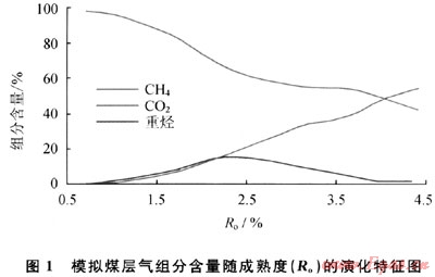 模型表明了演化階段不同則各種煤層氣組分含量的變化情況。煤層氣組分組成與煤的演化階段、成熟度和保存情況密切相關(guān)。成煤有機(jī)質(zhì)分別最終演化到Ro最大為2.O%、3.0%和4.O%時(shí)煤層氣的組分構(gòu)成不同。例如,當(dāng)Ro=1.0%演化到Ro=2.O%時(shí),煤層氣組成中CH4的含量為45%,CO2為9%,重?zé)N46%;Ro=1.0%演化到Ro=3.0%時(shí),CH4含量為52%,CO2為24%,重?zé)N23%;Ro=1.0%演化到Ro=4.0%時(shí),CH4含量為66%,CO2為29%,重?zé)N5%。由此可見,有機(jī)質(zhì)熱成熟演化過(guò)程越長(zhǎng),煤層氣組分中烴類氣體CH4含量越高,重?zé)N氣體的含量越低。這一規(guī)律與實(shí)際的地質(zhì)環(huán)境中,煤巖演化程度愈高,煤層甲烷的含量越高,重?zé)N含量愈低的情況相符的。而C02基本保持了隨成熟度演化過(guò)程增長(zhǎng)而含量增大的趨勢(shì)。所以,在應(yīng)用煤層氣組分進(jìn)行煤層氣分類時(shí)要考慮這些因素的影響。