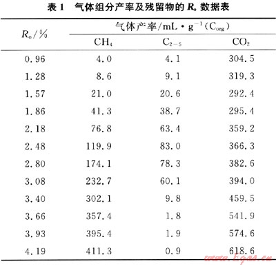 研究采用泥炭進(jìn)行煤層氣組分及演化的模擬實(shí)驗(yàn)研究。泥炭被認(rèn)為是成煤的原始物質(zhì),基本未經(jīng)歷加熱過(guò)程,其中生成煤層氣有機(jī)質(zhì)組分保留較為完整。泥炭樣品采自四川省若爾蓋沼澤,采樣深度為3.0~3.2m。實(shí)驗(yàn)在封閉高溫高壓體系和2℃/h升溫速率條件下進(jìn)行熱解實(shí)驗(yàn)研究,分析的煤層氣組分主要包括CH4、重?zé)N和CO2。獲得的產(chǎn)率和鏡質(zhì)體反射率數(shù)據(jù)如表1。樣品的其他基本分析和實(shí)驗(yàn)方法均見本文參考文獻(xiàn)[3]。