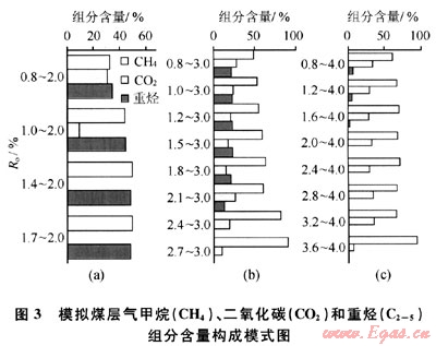 成煤有機(jī)質(zhì)的熱演化程度增加,生成的煤層氣氣體組分的含量會(huì)不斷發(fā)生變化。揭示一定的成熟度區(qū)間范圍內(nèi)這些變化的規(guī)律性,對(duì)于認(rèn)識(shí)和描述不同成熟度條件下煤層氣的特征產(chǎn)生重要影響。圖1展示了本次研究中所研究的模擬煤層氣組分CH4、C2-5和CO2的組分含量隨成熟度增加的演化特征。