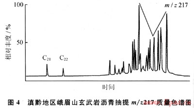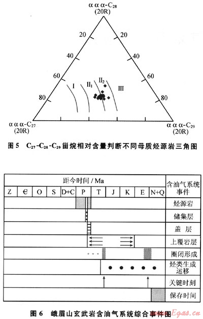 另據玄武巖瀝青的m/z217質量色譜圖(圖4),規(guī)則甾烷呈近“V”字形,C27占優(yōu)勢,反映水生生物輸入有機質較多,利用C27-C28-C29甾烷相對含量判斷烴源巖母質類型(圖5),表明除水生生物外,還有部分腐殖型有機質的輸入;由于上覆的沙灣組在漢王場-青神-犍為-珙縣以東地區(qū),已相變?yōu)楹谏搸r夾薄層石灰?guī)r,有時可見薄層碳質頁巖和煤層[3],故推測氣源可能有上二疊統(tǒng)煤系地層的貢獻。