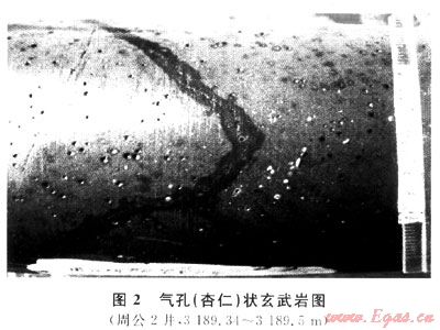 多見于杏仁狀、氣孔(杏仁)狀玄武巖中(圖2),高溫玄武熔巖冷凝時氣體不斷向上排出,上部熔巖溫度下降快,成巖后使氣體封閉在巖體中形成氣孔;后因熱液作用和重結晶作用部分氣孔被次生礦物所充填,這種半充填的杏仁和未充填的氣孔是玄武巖原生孔隙的主體,但多是孤立的,需靠裂縫溝通。