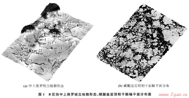 古地貌是控制一個盆地后期構(gòu)造與沉積特征的主要因素,對沉積體系內(nèi)的儲層發(fā)育與分布以及油氣藏的富集具有一定的控制作用。通過古地貌恢復(fù)技術(shù)與三維可視化技術(shù)相結(jié)合,可以從空間角度分析古地貌對鹽下礁體的控制作用。由于本區(qū)上覆膏巖、鹽巖與碳酸鹽巖速度的差異,極易形成強的巖性界面。另一方面,礁體發(fā)育區(qū)特別是含氣后,速度降低,波阻抗差減小,振幅也會降低;而礁間帶致密石灰?guī)r儲層,連續(xù)性好、振幅強,而因利用振幅屬性能較好的預(yù)測礁體發(fā)育區(qū)。相干屬性對地層的不連續(xù)性特別敏感,可以識別斷裂、裂縫的分布范圍。將古地貌與相干振幅屬性相結(jié)合,可以更好的預(yù)測礁體的平面分布。圖1-a是研究區(qū)B區(qū)塊楊古伊-恰什古伊氣田碳酸鹽巖沉積時的古地貌,鉆井證實,生物礁發(fā)育于古地貌較高部位。從圖1-b的相干振幅平面分布圖可以看出,生物礁發(fā)育部位相干性差、振幅為中低振幅,裂縫較為發(fā)育,儲層物性較好,與古地貌隆起區(qū)的分布一致。利用古地貌與相干振幅屬性相結(jié)合,在斜坡相帶已發(fā)現(xiàn)了楊古伊氣田和恰什古伊氣田。鉆井證實,斜坡帶的點礁群是擴大B區(qū)塊探明儲量的有利地區(qū)。