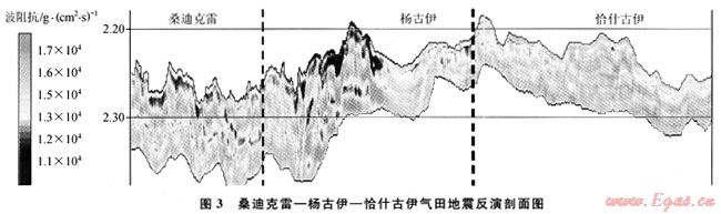 圖3為桑迪克雷-楊古伊-恰什古伊三維區(qū)自南西-北東向分布的反演波阻抗剖面。紅色低阻抗儲層,主要分布在碳酸鹽巖地層的上部,波阻抗值大約在15000g/(cm2·s);藍色為致密儲層發(fā)育段,具有低聲波時差、高密度的特征,與前述分析結(jié)果較為吻合。從反演結(jié)果可以看出,西南部桑迪克雷、楊古伊氣田波阻抗值相對較小,礁體較為發(fā)育,而東北部恰什古伊氣田波阻抗值相對較大,礁體發(fā)育程度較南部略顯致密。