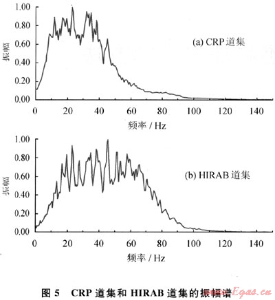 圖5-a為CRP道集目的層段(1500~2200ms)的振幅譜,頻帶為6~48Hz,頻帶寬度為42Hz,主頻為27Hz(振幅譜中的強(qiáng)低頻能量是由遠(yuǎn)炮檢距地震道的強(qiáng)低頻能量引起);圖5-b為HIRAB道集同層位的振幅譜,頻帶為12~76Hz,頻帶寬度為64Hz,主頻為44Hz??梢钥闯觯航?jīng)過(guò)處理后的HIRAB道集的高頻拓展28Hz,頻帶展寬22Hz,主頻提高了17Hz。