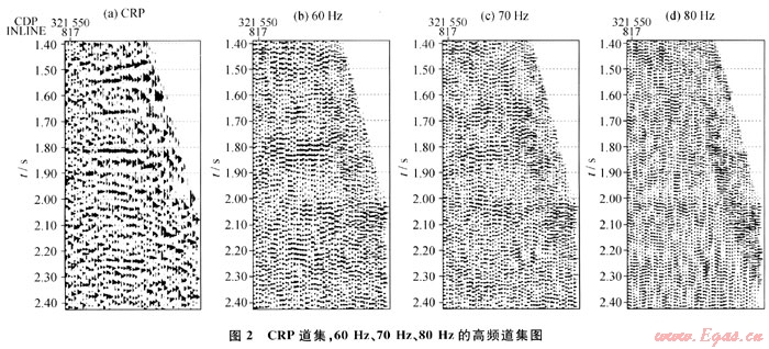 圖2為CRP道集及其60Hz、70Hz和80Hz的高頻道集。從圖中可以看出,60Hz和70Hz高頻道集的反射同相軸與CRP道集基本一致,而80Hz高頻道集的反射同相軸與CRP道集的一致性降低。對(duì)全區(qū)CRP道集的分析表明,本區(qū)70Hz以下的反射信號(hào)基本為有效信號(hào)[6]。
