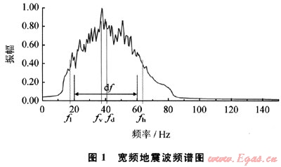在地震信號(hào)有效頻帶內(nèi),設(shè)頻寬為df、主頻為fd、視主頻(地震剖面上能夠看到的主頻)為fv、振幅衰減為0.4的最低有效頻率(有效頻帶低頻)為fl、振幅衰減為0.4的最高有效頻率(有效頻帶高頻)為fh。則有效頻帶的頻寬為: