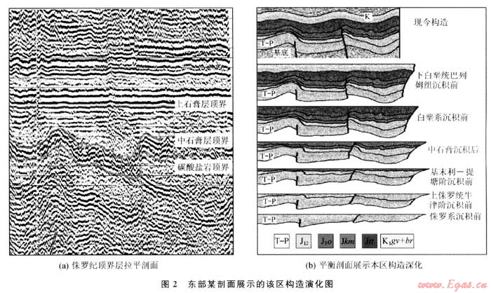 在上侏羅統(tǒng)卡洛夫-牛津階沉積完畢之后,圖蘭地臺(tái)回返,中央卡拉庫姆隆起抬升,而阿姆河盆地區(qū)域則繼續(xù)沉降,由此形成了盆地區(qū)域內(nèi)封閉的海洋沉積環(huán)境。沉積了巨厚的鹽膏層。從地震剖面上可以清楚地反映出該套鹽膏層受擠壓后流動(dòng)變形的形態(tài),以往的認(rèn)識認(rèn)為[4],鹽膏層發(fā)生塑性流動(dòng)的擠壓力是由晚古近世開始的新構(gòu)造運(yùn)動(dòng)作用的結(jié)果。但通過平衡剖面和層拉平剖面技術(shù)清晰地反映出了在該套鹽膏層中部的中石膏沉積完畢之后即發(fā)生一期強(qiáng)烈的構(gòu)造運(yùn)動(dòng),該期構(gòu)造運(yùn)動(dòng)不僅僅使鹽膏層發(fā)生塑性流動(dòng)而形變。更重要的是本區(qū)的構(gòu)造格局因此而改變,同時(shí)本區(qū)部分構(gòu)造圈閉也在此時(shí)形成。
