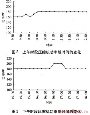在空調模式下,工作設備主要有空調壓縮機、空調風機、加壓風機。在實驗過程中,測試開始后0.5h系統(tǒng)進入穩(wěn)定階段,采用功率表測試這3個設備的功率。上下午時段空調壓縮機功率的測試數據分別見圖2、3。由圖2、3可知,在上午時段,壓縮機的最大功率達到180W,最小功率為160W。在下午時段,最大功率達到了200W,其余時段保持在180W。