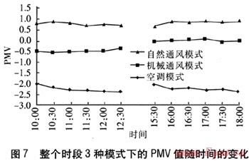 整個時段3種模式下的PMV值隨時間的變化見圖7。由圖7可知,3種模式的PMV值差別較為顯著,自然通風模式下PMV值在0.5以上;空調模式下達到-2.0以下,偏離最佳熱舒適度的程度很大;采用機械通風模式,上午時段的PMV平均值為-0.53,下午時段約為0,比上午時段更加接近最優(yōu)熱舒適度。