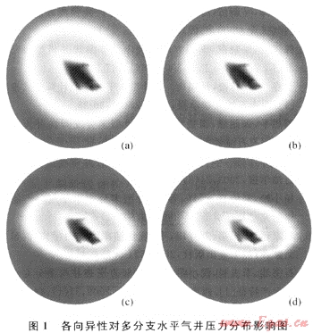 從圖1中可以看出,考慮氣藏各向異性后,多分支水平井近井地帶壓力分布發(fā)生了一定的偏轉(zhuǎn),各方向滲透率差異越大,壓力分布圖偏轉(zhuǎn)的越嚴重。
