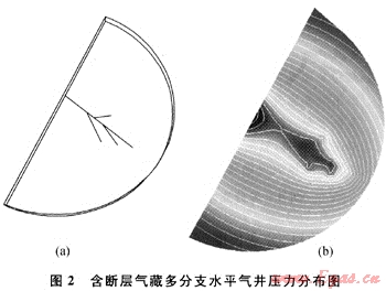 假設(shè)氣藏中存在一條不滲透邊界(圖2-a),根據(jù)滲流力學(xué)鏡像反映原理,可將斷層存在情況下1口生產(chǎn)井的情況等效為無限大地層沿斷層面對稱的2口生產(chǎn)井共同生產(chǎn)的情況??紤]斷層影響后多分支水平井壓力分布圖如圖2-b所示。