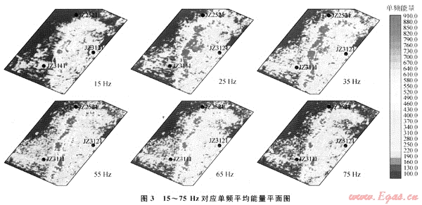 利用基于廣義S變換的頻譜成像儲(chǔ)層預(yù)測(cè)技術(shù)對(duì)JZ31-6構(gòu)造東二下段北部濁積體開展了研究。利用頻率掃描結(jié)果分析東二下段北部濁積體整體和局部單頻能量強(qiáng)弱的變化,進(jìn)而了解砂體整體和局部特征如厚度、砂體尖滅邊界等。圖3為東二下段北部濁積體從15Hz到75Hz對(duì)應(yīng)單頻平均能量的平面圖,顏色越紅表示能量越強(qiáng)。從15Hz到35Hz的分頻平面圖反映出了該濁積體厚層和整體特征;從35Hz到75Hz的分頻平面圖,逐步反映出了砂體薄層和局部特征。35Hz的分頻平面圖比較模糊的地反映出了濁積體由3個(gè)局部砂體組成。在更高頻率的分頻平面圖上,更清楚地反映出北部濁積體是由3個(gè)局部砂體組成的。這一預(yù)測(cè)結(jié)果已被后來(lái)鉆井所證實(shí)。