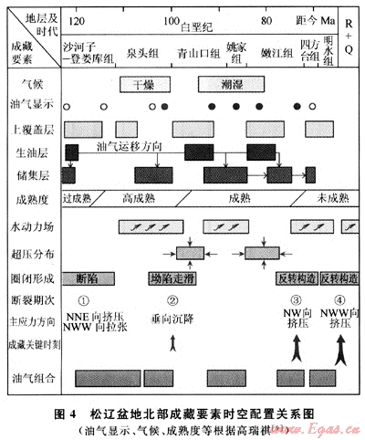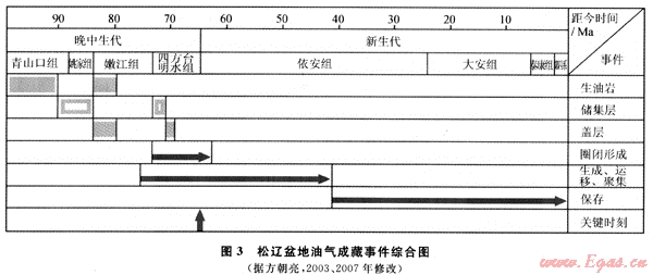 1) 松遼盆地晚期各種成藏要素在時間上和空間上形成了良好的配置關(guān)系,這為油氣在淺部地層成藏提供了基本的條件,淺層油氣是沿斷層向上運(yùn)移的結(jié)果。確定晚期成藏調(diào)整的關(guān)鍵時刻是明水期-依安期末。