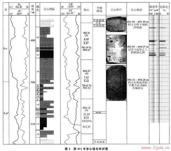 四方臺組儲蓋組合:包括Ⅱ5-sSQ2中上部泥巖蓋層及其以下四方臺組地層,以Ⅱ5-sSQ2中上部泥巖蓋層起到?jīng)Q定作用。該層厚度最大,分布范圍廣,濱淺湖相沉積;其下為四方臺組砂巖儲層,厚度大,分布廣。