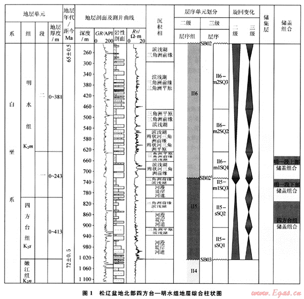 松遼盆地在演化過程中經(jīng)歷了不同的構(gòu)造運(yùn)動期次,不同的期次發(fā)育不同的沉積特征,在松遼盆地晚期四方臺組和明水組總體以氧化-半還原環(huán)境為主,在平面上以廣闊的泛濫平原、淺水湖泊三角洲和濱淺湖相為主,四方臺組初期發(fā)育的泛濫平原河道可以作為有效的儲集層,另外四方臺組晚期和明水初期所發(fā)育的濱淺湖泥質(zhì)沉積可作為上覆蓋層,同時配合下伏的生油巖、斷裂輸導(dǎo)通道、有效圈閉和油氣運(yùn)聚保存的空間配置關(guān)系,可以構(gòu)成良好的成藏組合(圖3)。