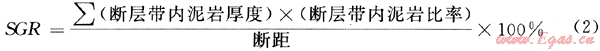 斷層活動(dòng)過(guò)程中,由于拖曳、擠壓、研磨和塑性流動(dòng)等作用,沿?cái)嗔逊植嫉臉O細(xì)粒的非滲透性泥狀物,敷著在斷層面上,使斷裂帶具有高的排驅(qū)壓力,增強(qiáng)了斷層的封閉性。反映涂抹效應(yīng)的常用指標(biāo)有多種[1、21~22],主要為斷層泥比率(SGR)、縱向封堵系數(shù)(R)和橫向封堵系數(shù)(F)、泥巖涂抹潛勢(shì)(CSP)等。其中:
