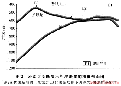 寺頭斷層位于沁水盆地東南部地區(qū),斷層走向變化較大,在端氏以北,走向?yàn)?0°~25°,端氏以南變?yōu)?0°左右,傾向NW,傾角為70°~85°。斷層落差變化范圍較大,在寺頭一帶最大,超過(guò)360m,向南北兩端變小。以往研究與實(shí)際勘探資料表明寺頭斷層對(duì)其東西兩側(cè)的潘莊一樊莊煤層氣藏和鄭莊煤層氣藏的水文地質(zhì)條件j構(gòu)造格局和煤層氣的賦存都具有明顯的控制作用[17~19]。因此探討寺頭斷層封閉機(jī)理對(duì)評(píng)價(jià)斷層兩側(cè)的煤層氣成藏具有重要的意義。