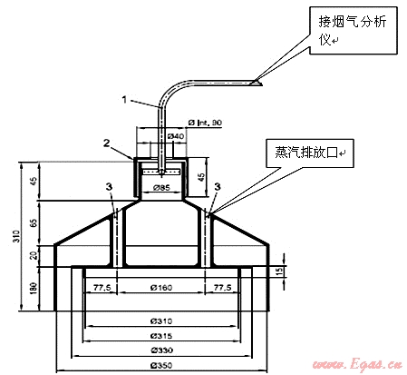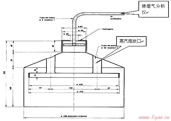 歐洲和南美的取樣器是個半封閉的罩形結(jié)構(gòu),煙氣通道和水蒸氣通道隔離,取樣原理采用我國燃?xì)鉄崴鞯姆绞?,也是按照熱?fù)荷的分級系列化制造,但是分級較少,不同熱負(fù)荷的燃燒器用鍋直徑和加水量有相同的情況,這種取樣器結(jié)構(gòu)和制作復(fù)雜,消耗材料多,笨重、造價(jià)高,對于系列化的結(jié)構(gòu)尺寸不完整,焊接要求高且難以保證,特別對于小功率燃燒器來講高度尺寸顯然不合理,甚至?xí)⒒鹧嫒堪菰谌悠鲀?nèi),造成二次空氣無法進(jìn)入,隨著使用時(shí)間增長變形也越來越大,焊接應(yīng)力致使修復(fù)困難。