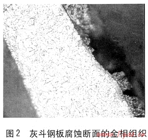 通過對鍋爐灰斗鋼板腐蝕斷面的金相組織分析(見圖2),腐蝕發(fā)生的機理主要是腐蝕介質(zhì)對鋼板的點蝕和沖蝕,由于點蝕和沖蝕的共同作用,使金屬表面的保護(hù)層剝離,腐蝕介質(zhì)與金屬直接接觸而發(fā)生腐蝕,含有顆粒等雜質(zhì)的高溫、高速煙氣連續(xù)不斷地直接沖擊金屬表面又進(jìn)一步造成鍋爐灰斗金屬表面的沖蝕,因此鍋爐灰斗在非常短的運行時間內(nèi)就出現(xiàn)了穿孔失效的情況[4]。