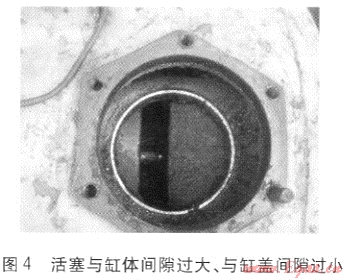 通過幾次大修發(fā)現(xiàn),拆卸的活塞端面與氣缸蓋邊緣有摩擦的痕跡,個別活塞有輕微的裂紋。通過仔細(xì)檢查發(fā)現(xiàn),壓縮機(jī)在運(yùn)行過程中活塞和氣缸的相對位置發(fā)生了變化,慣性沖擊使實(shí)際間隙超過了預(yù)先所留的間隙,缸蓋與活塞直接撞擊。圖4是活塞與缸體間隙過大、與缸蓋間隙過小的情況。