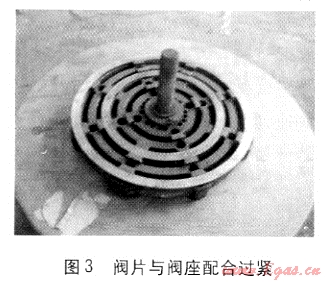 b. 對吸排氣閥進(jìn)行分組選擇裝配,防止閥片與閥座配合過緊、卡死而加大壓縮機(jī)工作阻力。在吸氣閥的組裝過程中,很多操作人員憑借經(jīng)驗(yàn)和感覺組裝吸氣閥。若壓縮機(jī)吸氣閥及運(yùn)動部件的尺寸公差裝配不當(dāng),極易發(fā)生閥片與閥座配合過緊卡死或徑向斷裂的現(xiàn)象。圖3是閥片與閥座配合過緊。