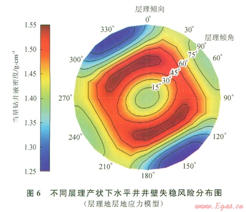 3)在鉆進地層傾角為30°~60°之間的頁巖氣藏水平井時,應(yīng)注意具有較高的坍塌壓力。近水平和近垂直的地層中坍塌壓力有所降低,降低幅度與地層傾向有關(guān),越接近最小地應(yīng)力方向下降幅度越大。